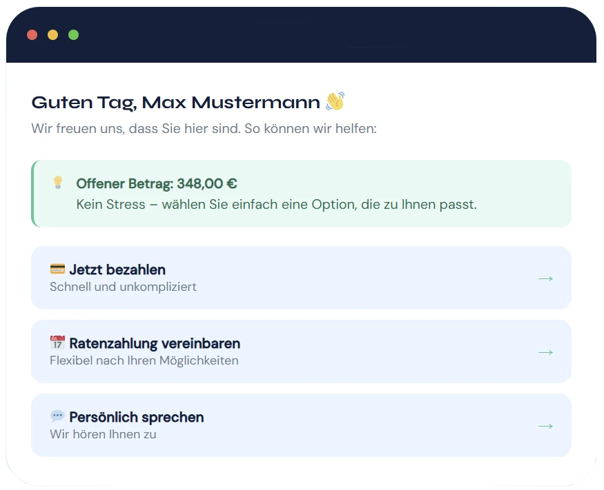 Eine offene Forderung bedeutet nicht das Ende einer guten Kundenbeziehung. Melden Sie sich einfach bei uns – wir finden gemeinsam eine Lösung, die zu Ihrer Situation passt.